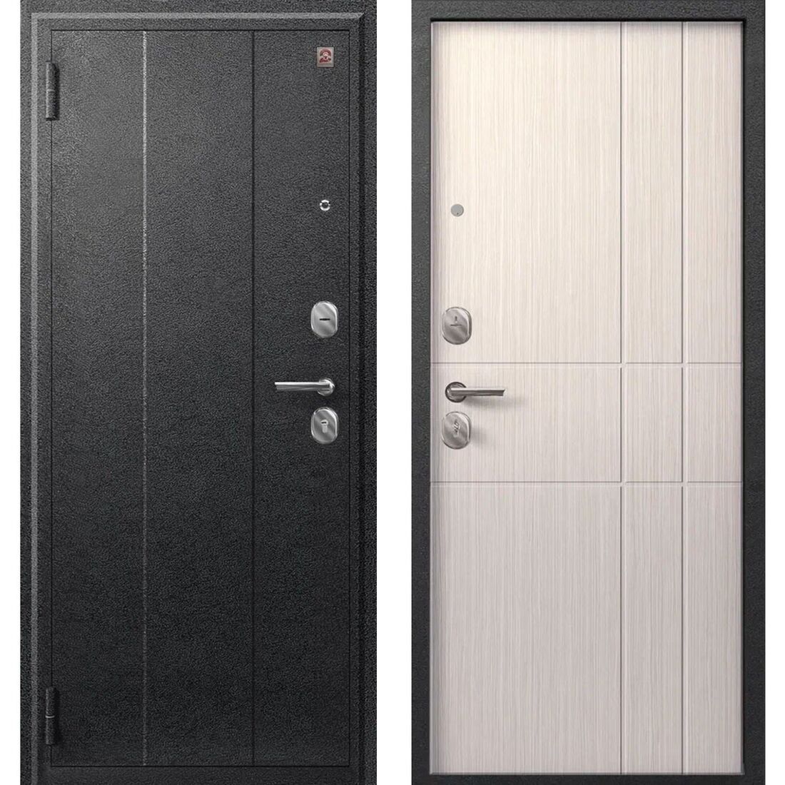Два контура уплотнения с трехкамерным уплотнителем надежно защищают от сквозняков и посторонних запахов. Замки Sezam 103 и 102 в сочетании с эксцентриком (регулятором притвора), цилиндрами (ключ-вертушка и ключ-ключ) и броненакладкой на цилиндр обеспечивают высокий уровень защиты от несанкционированного проникновения. Дополнительная ночная задвижка повышает безопасность, а раздельная ручка и глазок добавляют удобства в использовании. Противосъемные штыри и две петли обеспечивают дополнительную защиту от взлома.