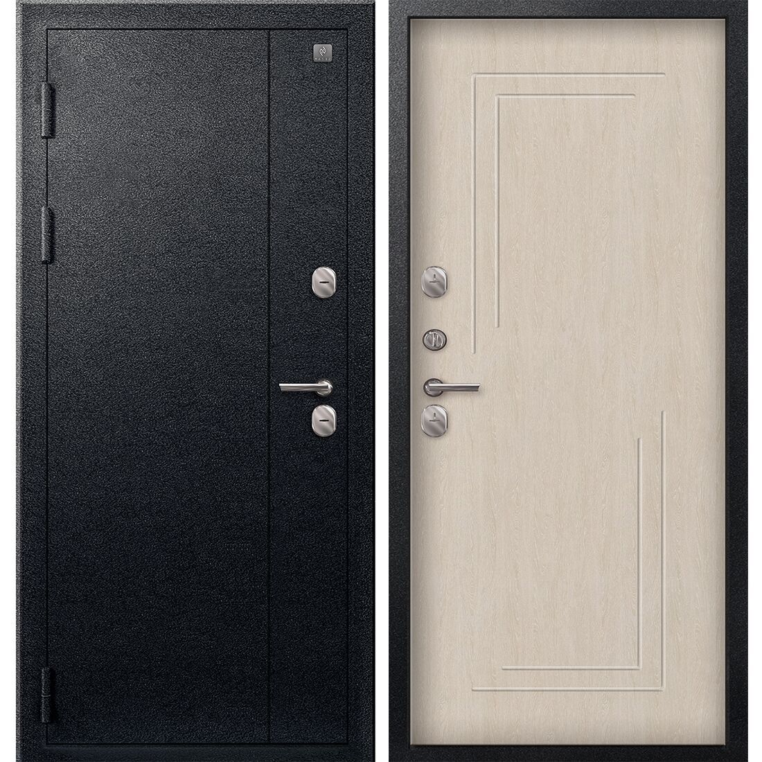 Модель T-100 Черный муар от SEZAM в цвете металла черный муар и с внутренней панелью из щита МДФ толщиной 16 мм в цвете седой дуб. Толщина полотна составляет 104 мм, максимальная толщина металла – 1 мм, а глубина короба может быть 139 мм или 121 мм (без наличника). Конструкция двери включает два контура уплотнения с трехкамерными уплотнителями и утеплитель из пенополистирола. Дверь оборудована двумя сувальдными замками (Sezam 103 и Sezam 101), ночной задвижкой, раздельной ручкой, тремя петлями и декоративными накладками с автоматической шторкой, а также имеет четырехкамерный терморазрыв на полотне и коробе.
